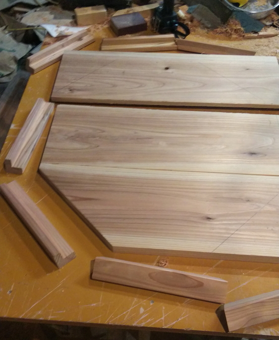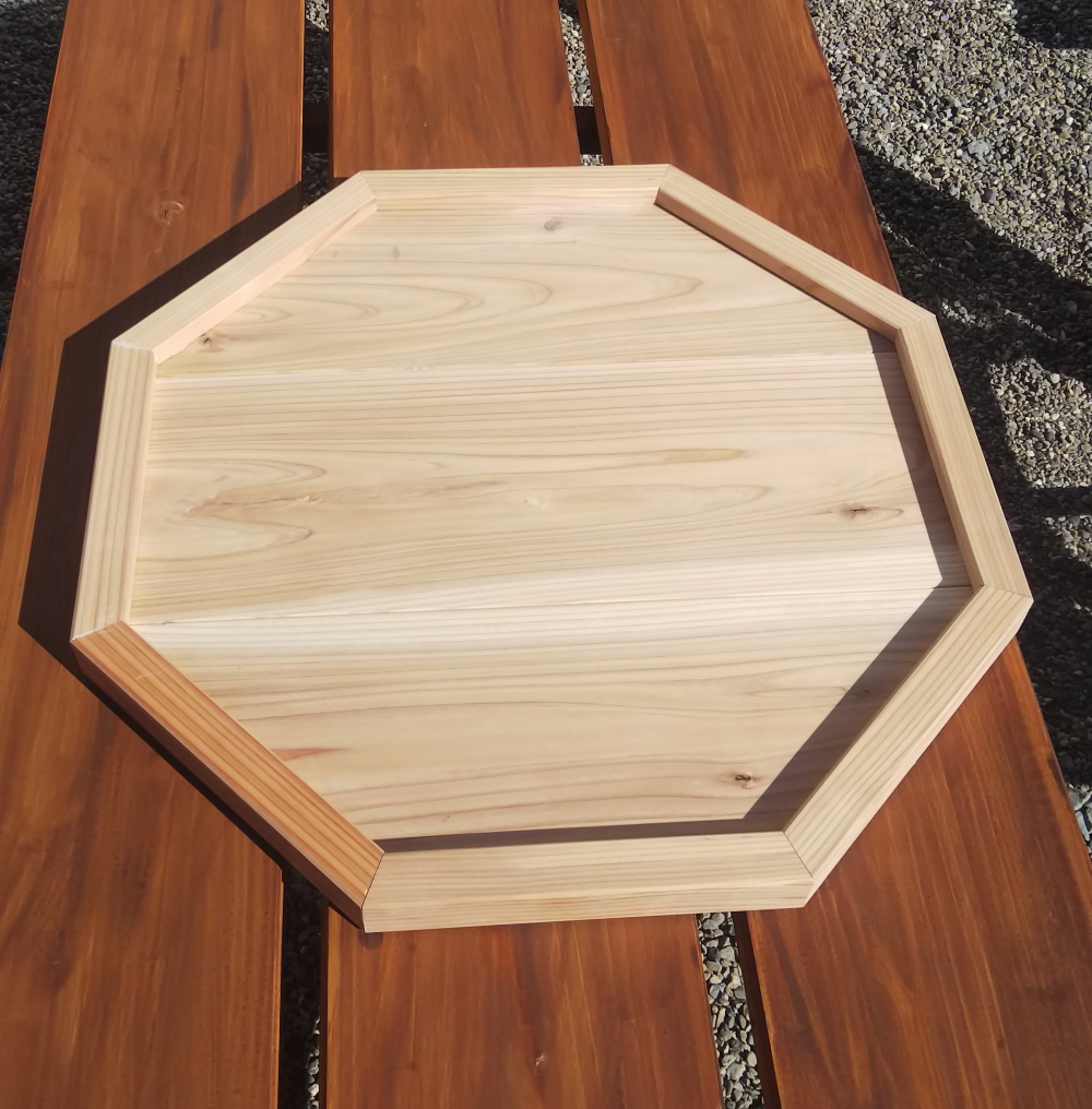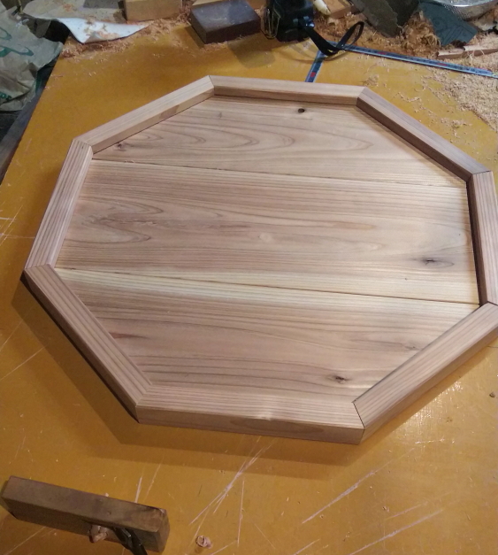 外周の縁取りは杉垂木、内側は杉破風板をはいで正8角形に加工してます。