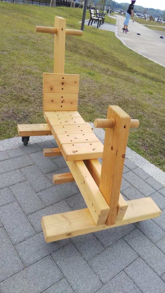 その他の部品は端材としてストックしてあるものを使いました。足を置く部分は杉垂木、前後の持ち手の部分はφ30のヒノキ材、背もたれはヒノキ材の1×4を用いました。後ろの持ち手は、大人が押すために作りました。高さは適当です。妻は持ち手が低すぎて腰が痛いと言っていたので、もう少し高さを工夫すればよかったかもしれません。