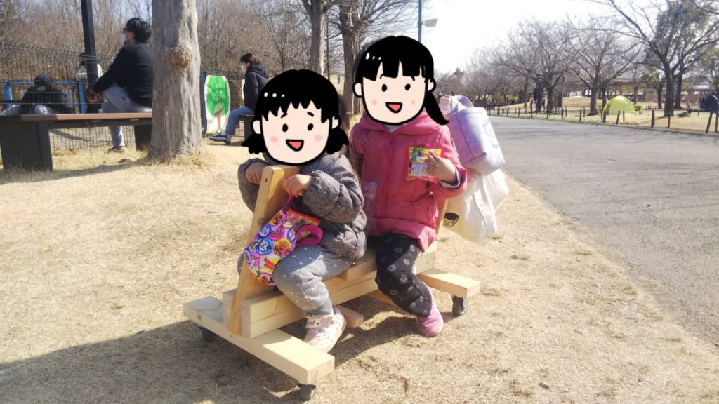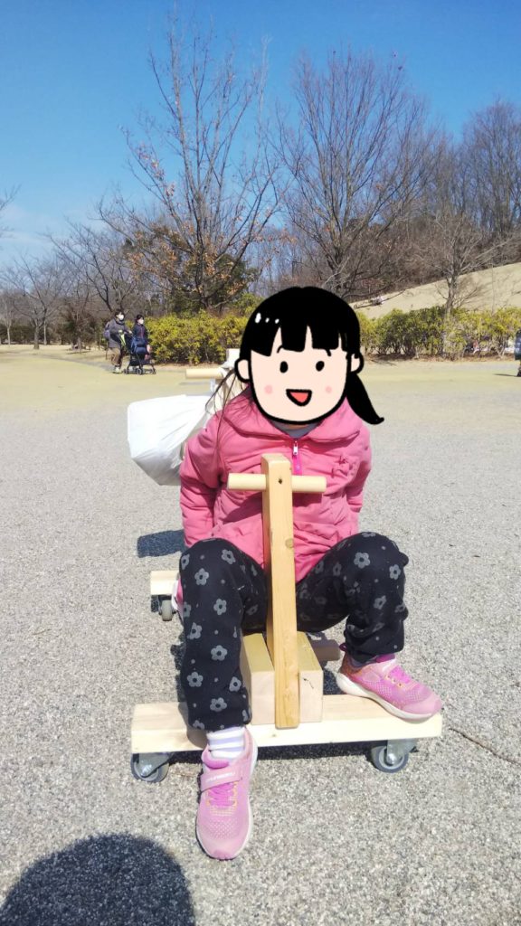 長女ちゃんが一人で乗って足でこいだり、二人で乗ってパパが押したりしました。二人ともおおはしゃぎでした。