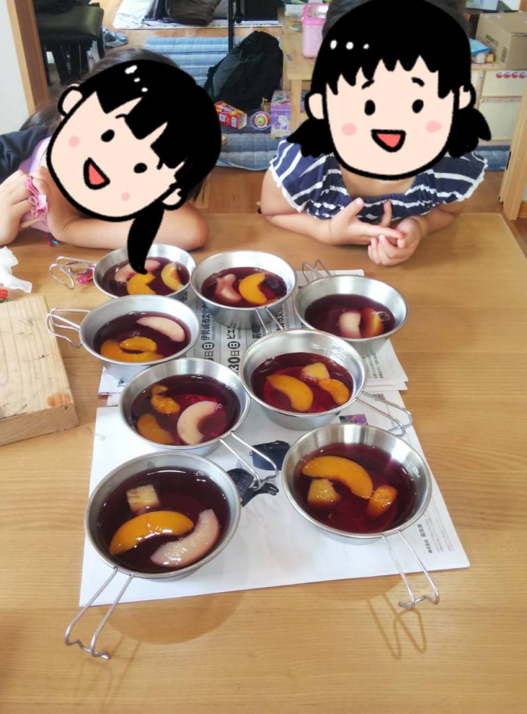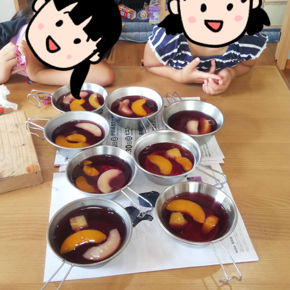 材料は、ぶどうジュース、フルーツ缶詰、寒天パウダーです。寒天の箱の裏の調理方法に従って、沸騰させたジュースとフルーツ缶に残ったシロップに寒天パウダーをいれてよく溶かします。シェラカップにフルーツを入れて、そこに先ほどの寒天ジュースを注ぎ、よく冷やして出来上がりです。フルーツはお好みで、ぶどうジュースのかわりにカルピスでもおいしいですよ。