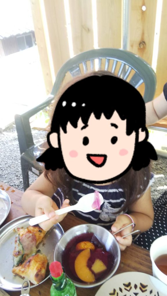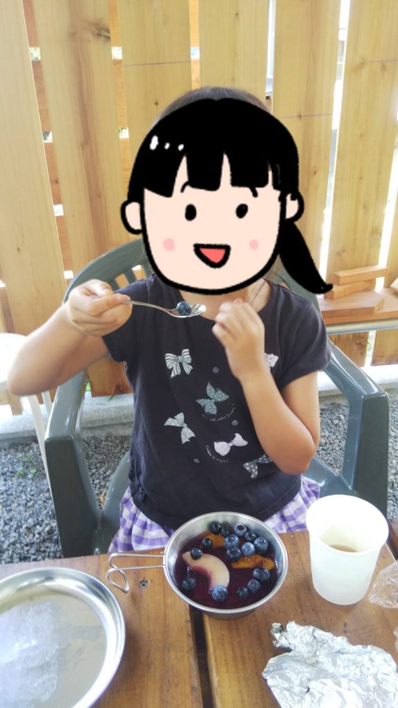 長女ちゃんが自家製のブルーベリーをトッピングして食べていました。次女ちゃんはブルーベリー少な目で食べています。